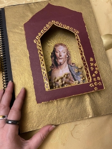 O Cristo barroco em oratório, feito para a apresentação da coleção, foi uma ideia que considero a cereja do bolo. E foi a última peça a ser montada após a criação do projeto da coleção. Sua forma, texturas, cores, tudo precisaria ornar com a proposta do tema selecionado. A escolha do design para o portfólio que apresenta a coleção do projeto factual é um ponto muito importante para ser observado. É neste momento que ganhamos a atenção do cliente de uma marca, por exemplo.
